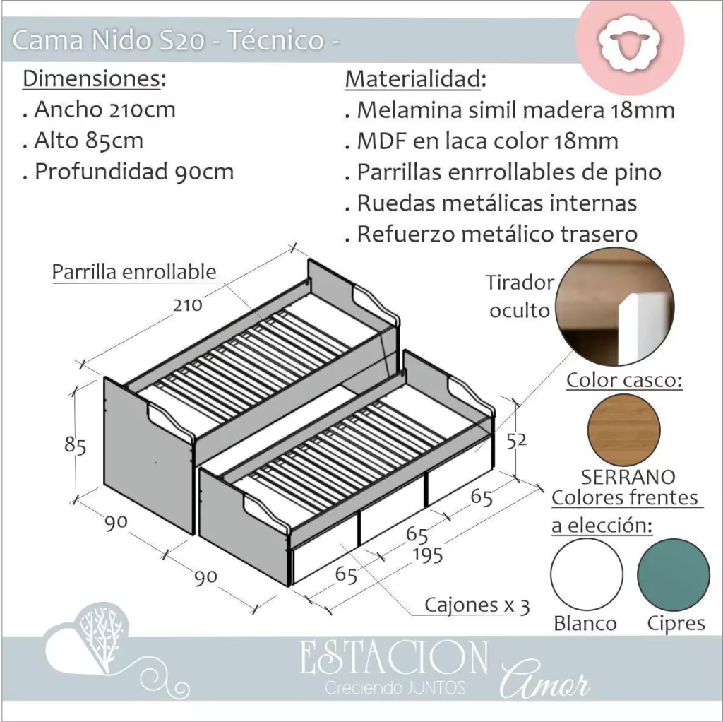 Cama Nido S20: Es ideal para niños y pequeños adolescentes, diseñada para optimizar el espacio en habitaciones reducidas. Esta cama es apta para dos colchones convencionales de 190 x 80 cm, lo que la convierte en una opción versátil y funcional.