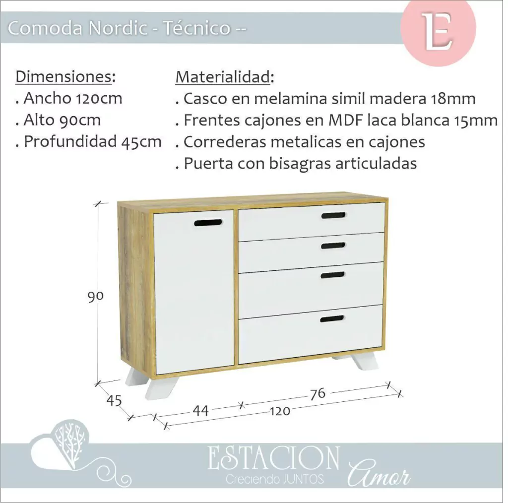 La Cómoda Nordic es el mueble ideal para aquellos que buscan combinar estilo y practicidad en sus espacios. Fabricada en MDP laminado que simula madera, su diseño moderno se complementa con frentes de cajones y una puerta en MDF laqueado blanco, aportando frescura a cualquier habitación.